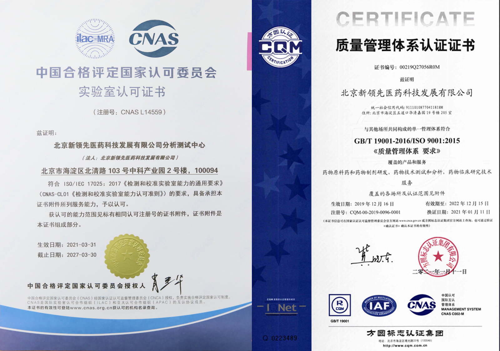北京新領先醫(yī)藥科技發(fā)展有限公司分析測試中心面向國內外藥企提供檢測技術服務,積累了豐富的藥物質量研究經驗,主要提供痕量物質如遺傳毒性雜質、元素雜質、殘留溶劑、聚合物雜質、復雜制劑輔料剖析、藥品接觸系統(tǒng)相容性研究等符合NMPA、FDA、EMA等法規(guī)要求的研究檢測服務。本中心先后通過了ISO9001質量管理體系認證和中國合格評定國家認可委員會(CNAS)實驗室認可資質。