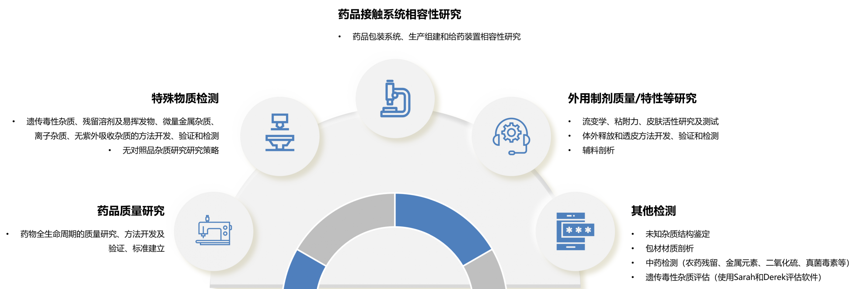 基于公司(集團)先進的檢測設備和完善的質量管理體系,能夠幫助項目組完成復雜化合物檢測方法的開發(fā)、相容性研究(包材、給藥裝置、生產組件等)及特殊雜質的檢測(元素雜質、遺傳毒雜質、金屬離子、聚合物等)。