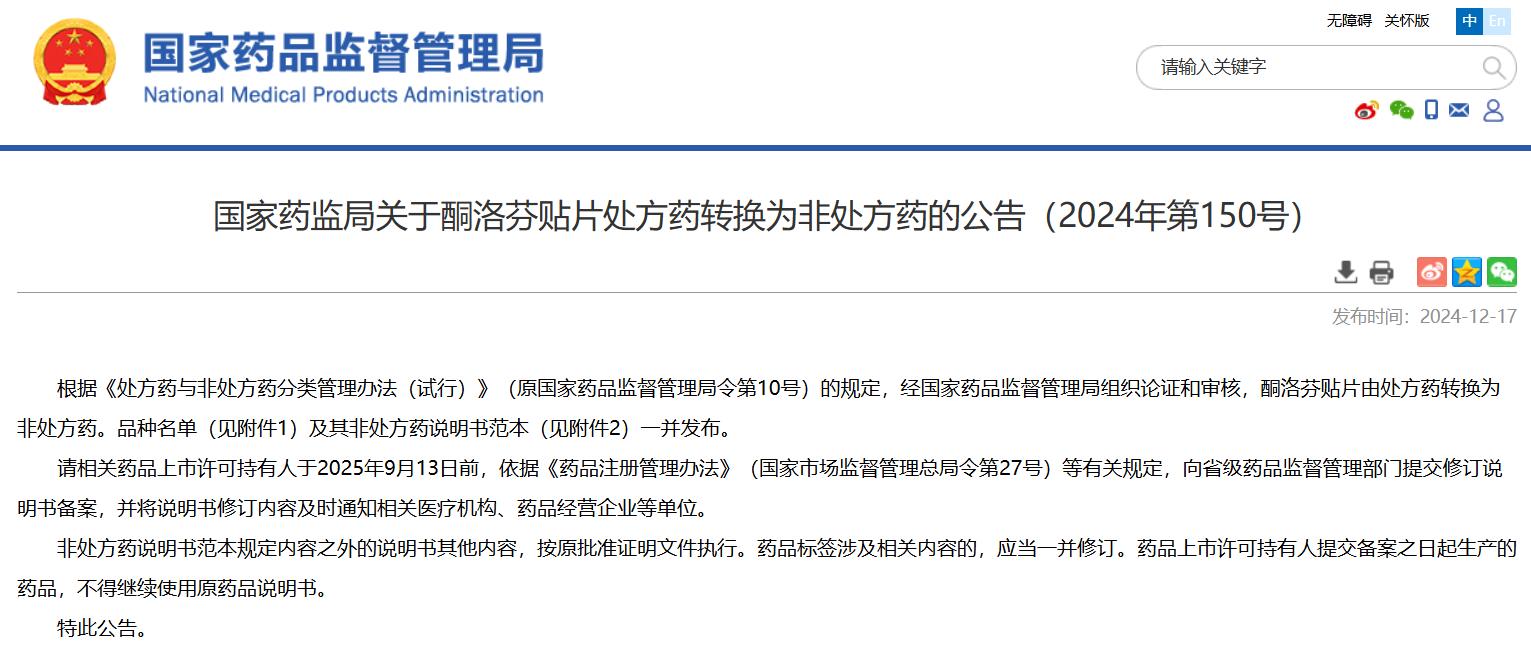 國家藥監局關于酮洛芬貼片處方藥轉換為非處方藥的公告(2024年第150號)