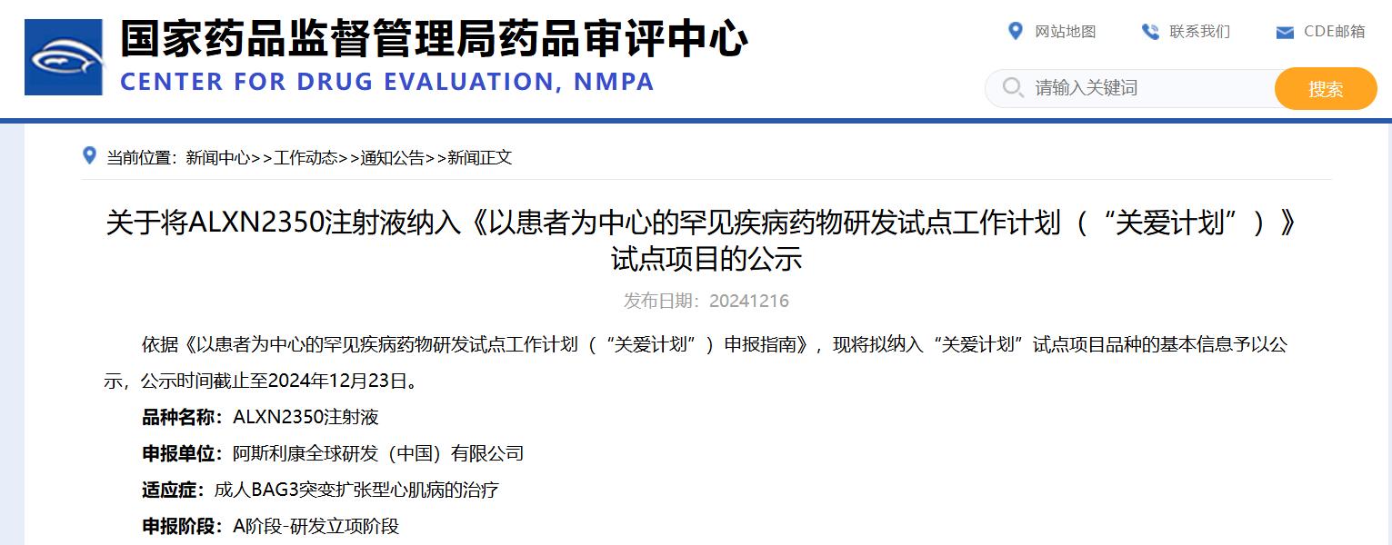 關于將ALXN2350注射液納入《以患者為中心的罕見疾病藥物研發試點工作計劃(“關愛計劃”)》試點項目的公示