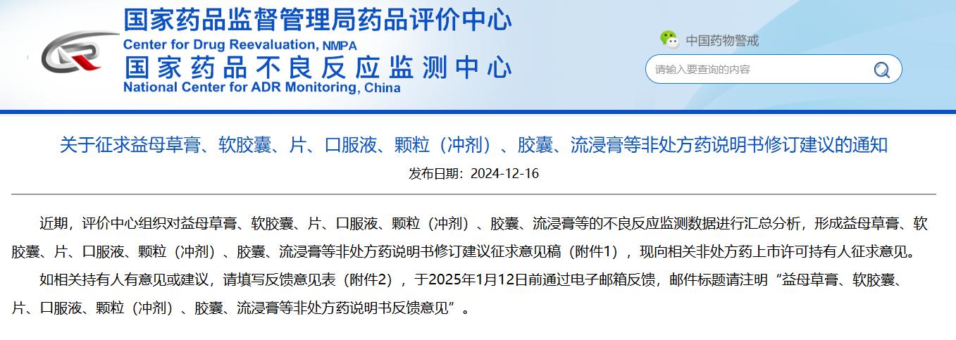 關于征求益母草膏、軟膠囊、片、口服液、顆粒(沖劑)、膠囊、流浸膏等非處方藥說明書修訂建議的通知
