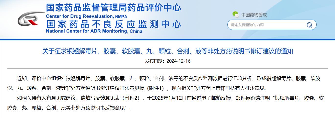 關于征求銀翹解毒片、膠囊、軟膠囊、丸、顆粒、合劑、液等非處方藥說明書修訂建議的通知