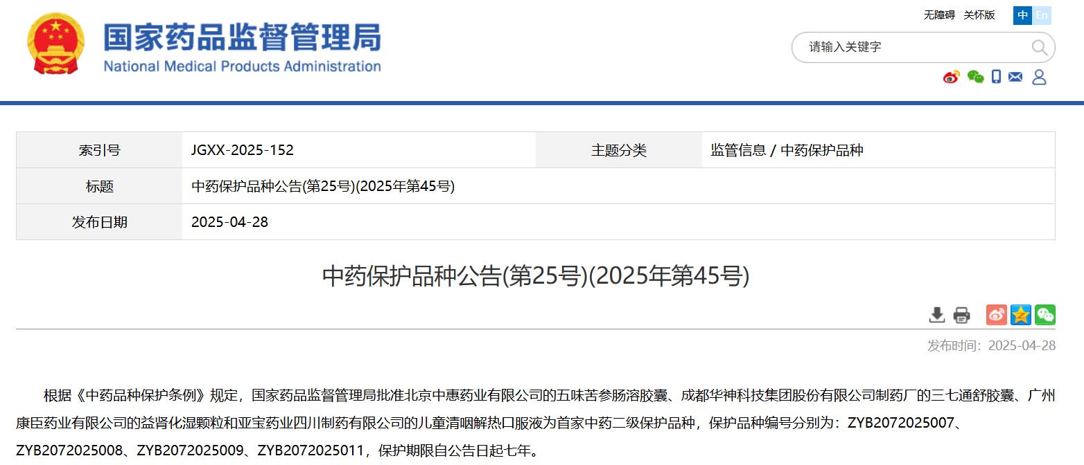 國家藥監局關于中藥保護品種的公告(延長保護期第22號)(2025年第44號)
