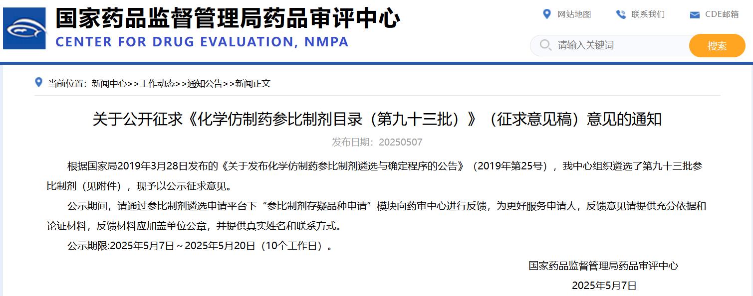 關(guān)于公開征求《化學(xué)仿制藥參比制劑目錄(第九十三批)》(征求意見稿)意見的通知