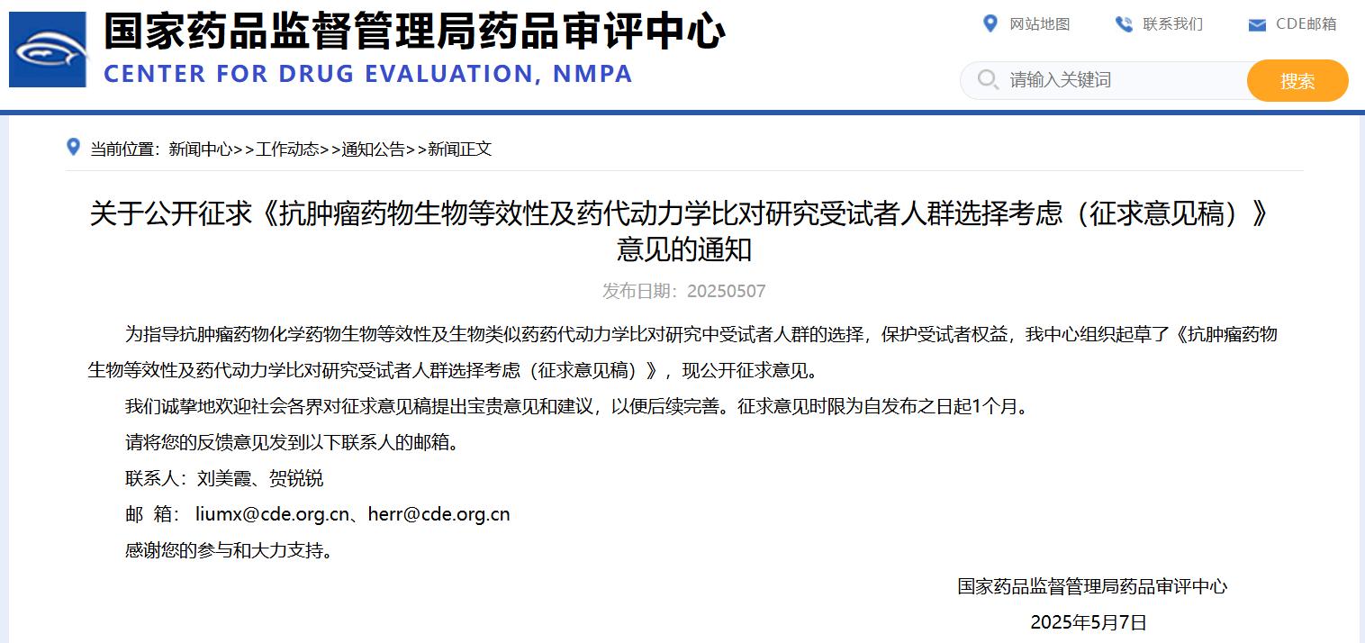 關(guān)于公開征求《抗腫瘤藥物生物等效性及藥代動(dòng)力學(xué)比對(duì)研究受試者人群選擇考慮(征求意見稿)》意見的通知
