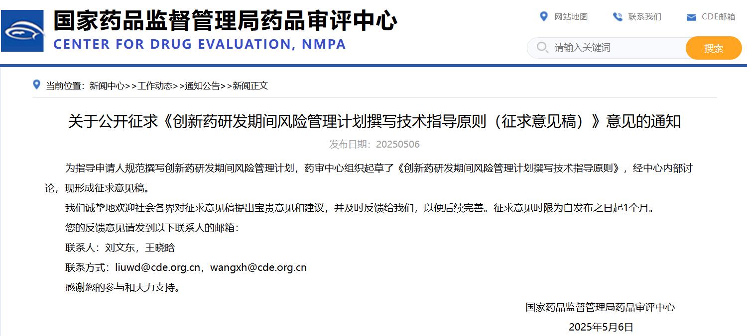 關(guān)于公開征求《創(chuàng)新藥研發(fā)期間風(fēng)險(xiǎn)管理計(jì)劃撰寫技術(shù)指導(dǎo)原則(征求意見稿)》意見的通知