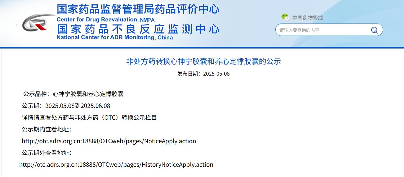 非處方藥轉(zhuǎn)換心神寧膠囊和養(yǎng)心定悸膠囊的公示