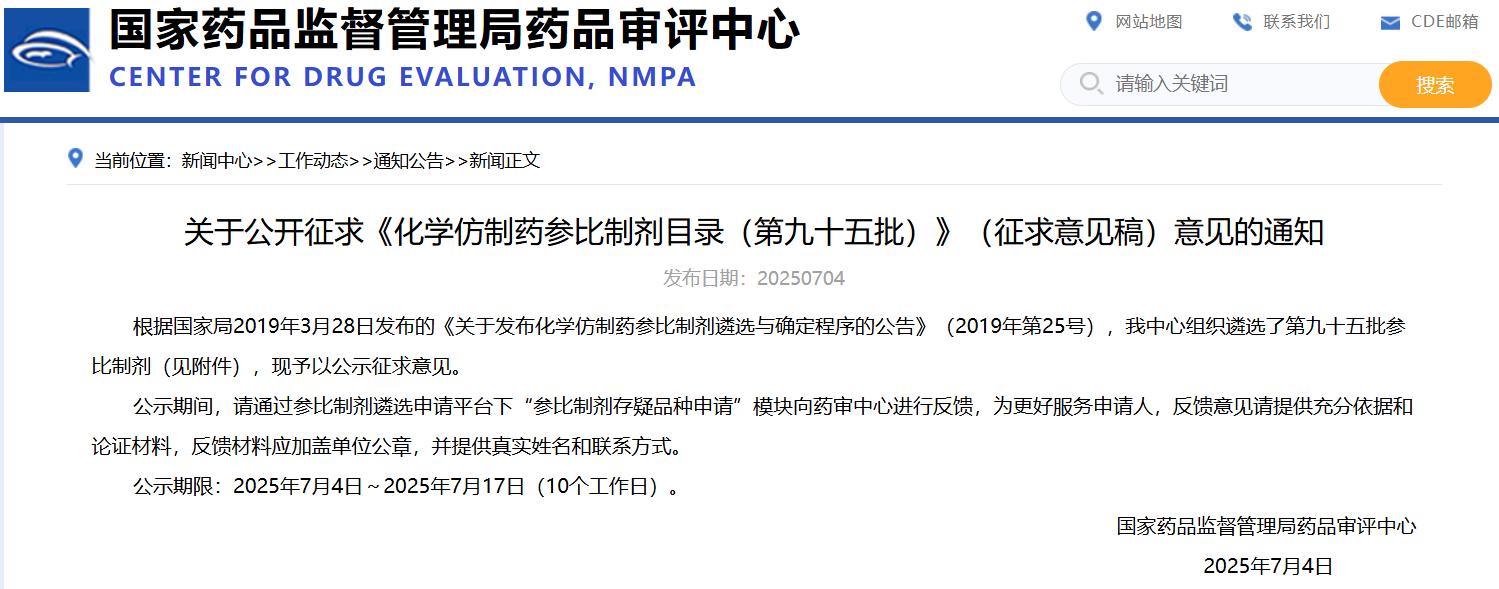 關于公開征求《化學仿制藥參比制劑目錄(第九十五批)》(征求意見稿)意見的通知