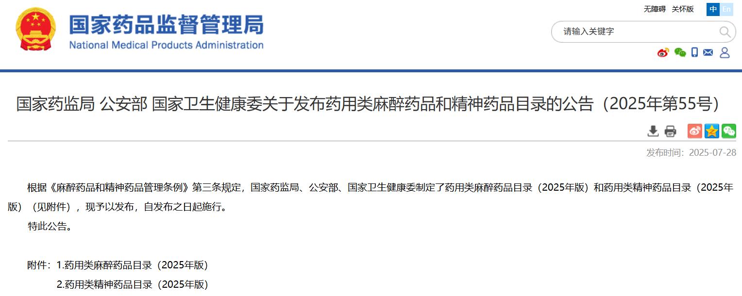 國家藥監局 公安部 國家衛生健康委關于發布藥用類麻醉藥品和精神藥品目錄的公告(2025年第55號)