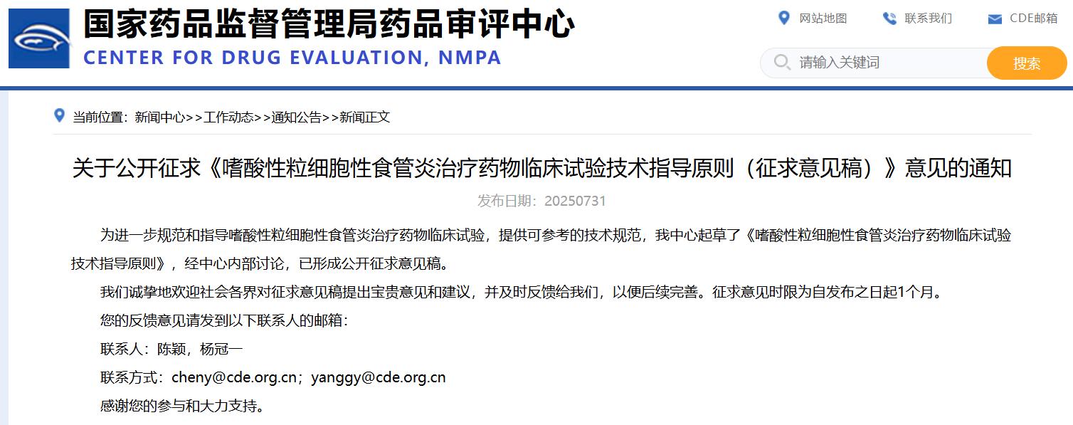 關于公開征求《嗜酸性粒細胞性食管炎治療藥物臨床試驗技術指導原則(征求意見稿)》意見的通知