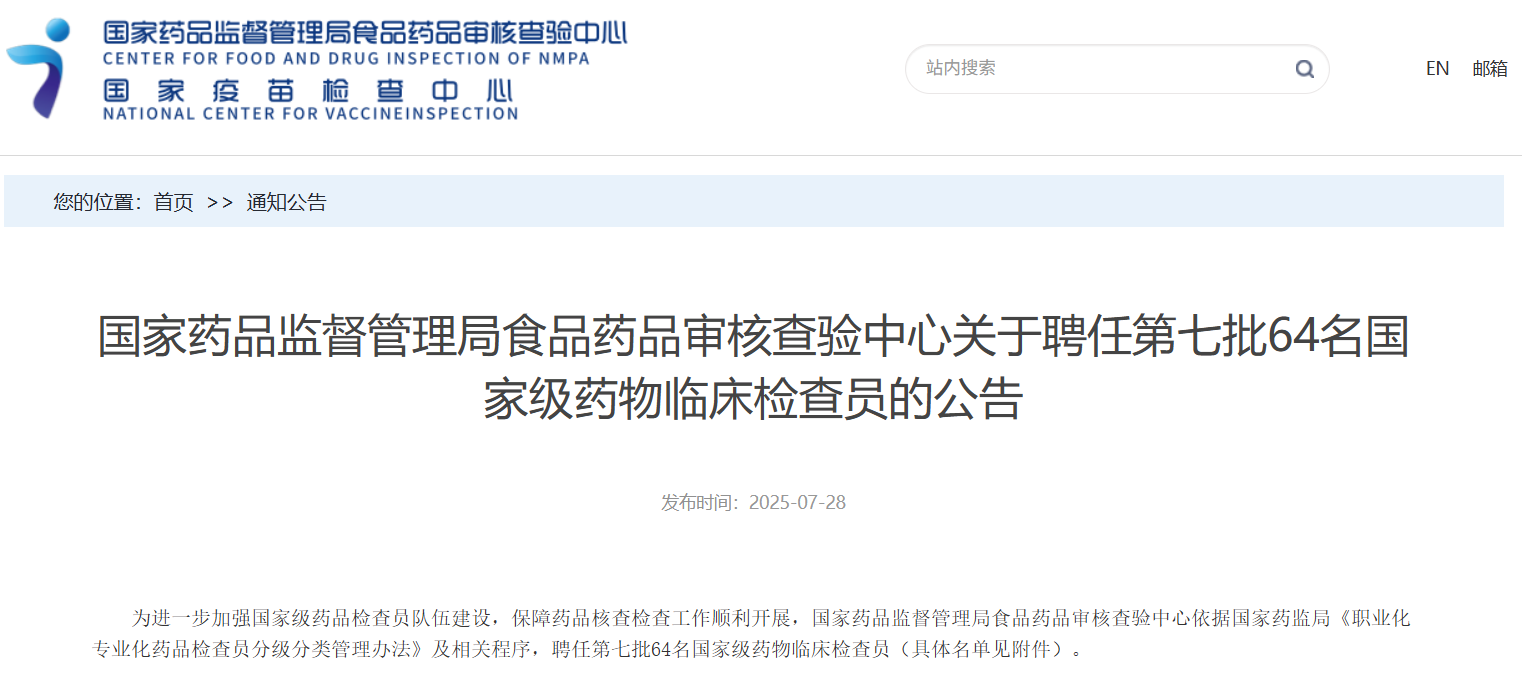 國家藥品監督管理局食品藥品審核查驗中心關于聘任第七批64名國家級藥物臨床檢查員的公告
