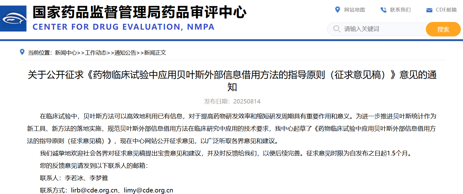 關于公開征求《藥物臨床試驗中應用貝葉斯外部信息借用方法的指導原則(征求意見稿)》意見的通知