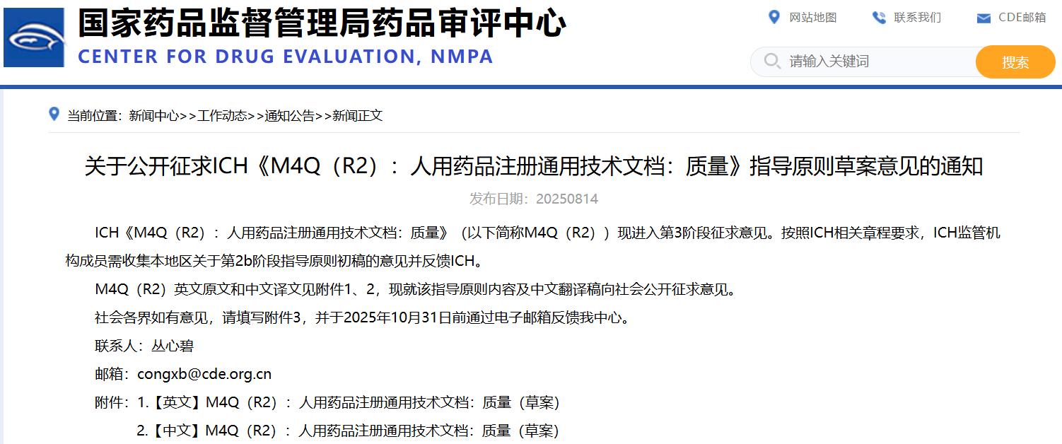 關于公開征求ICH《M4Q(R2):人用藥品注冊通用技術文檔:質量》指導原則草案意見的通知