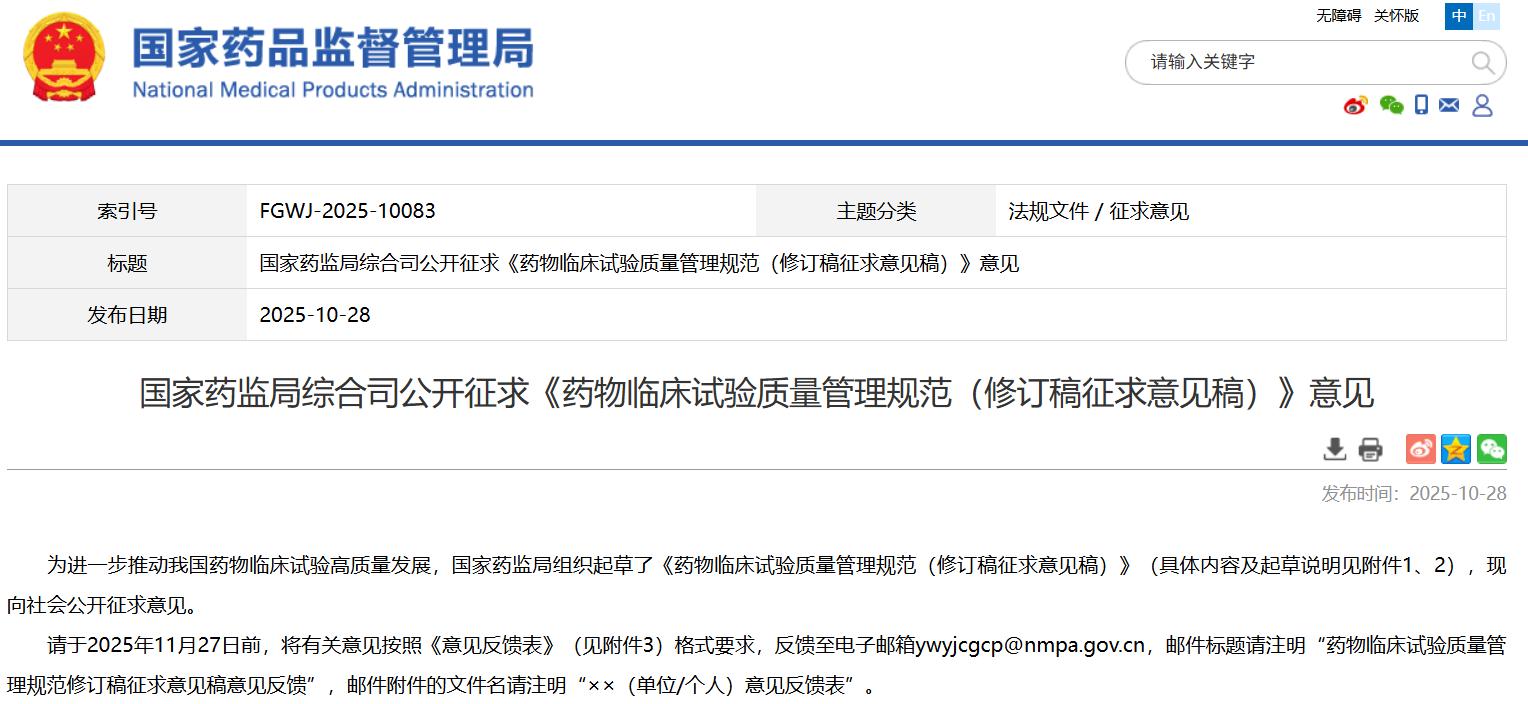 國家藥監局綜合司公開征求《藥物臨床試驗質量管理規范(修訂稿征求意見稿)》意見