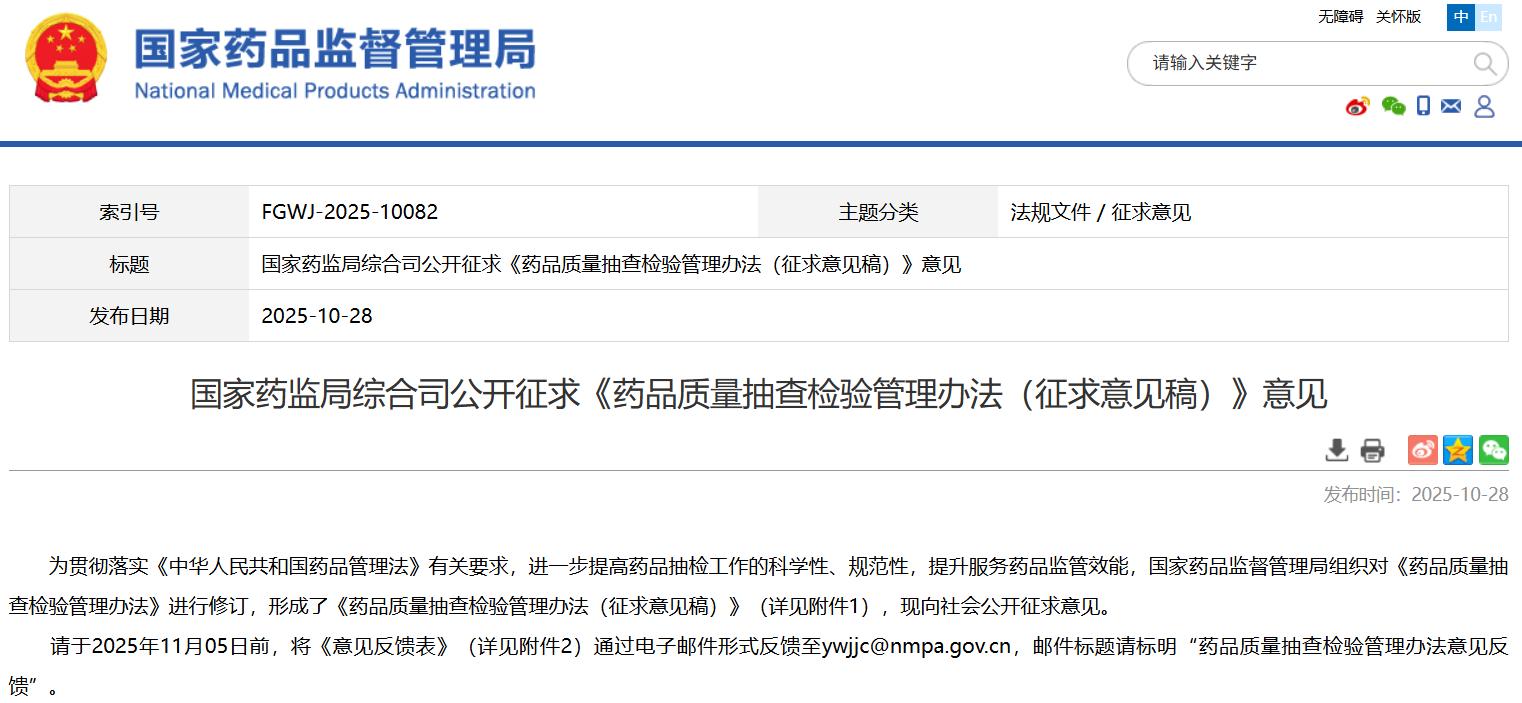 國家藥監局綜合司公開征求《藥品質量抽查檢驗管理辦法(征求意見稿)》意見
