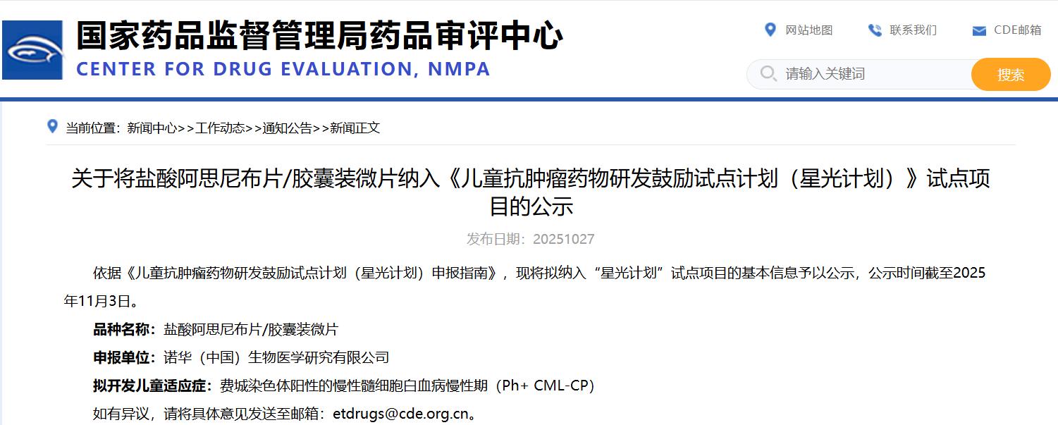 關于將鹽酸阿思尼布片/膠囊裝微片納入《兒童抗腫瘤藥物研發鼓勵試點計劃(星光計劃)》試點項目的公示