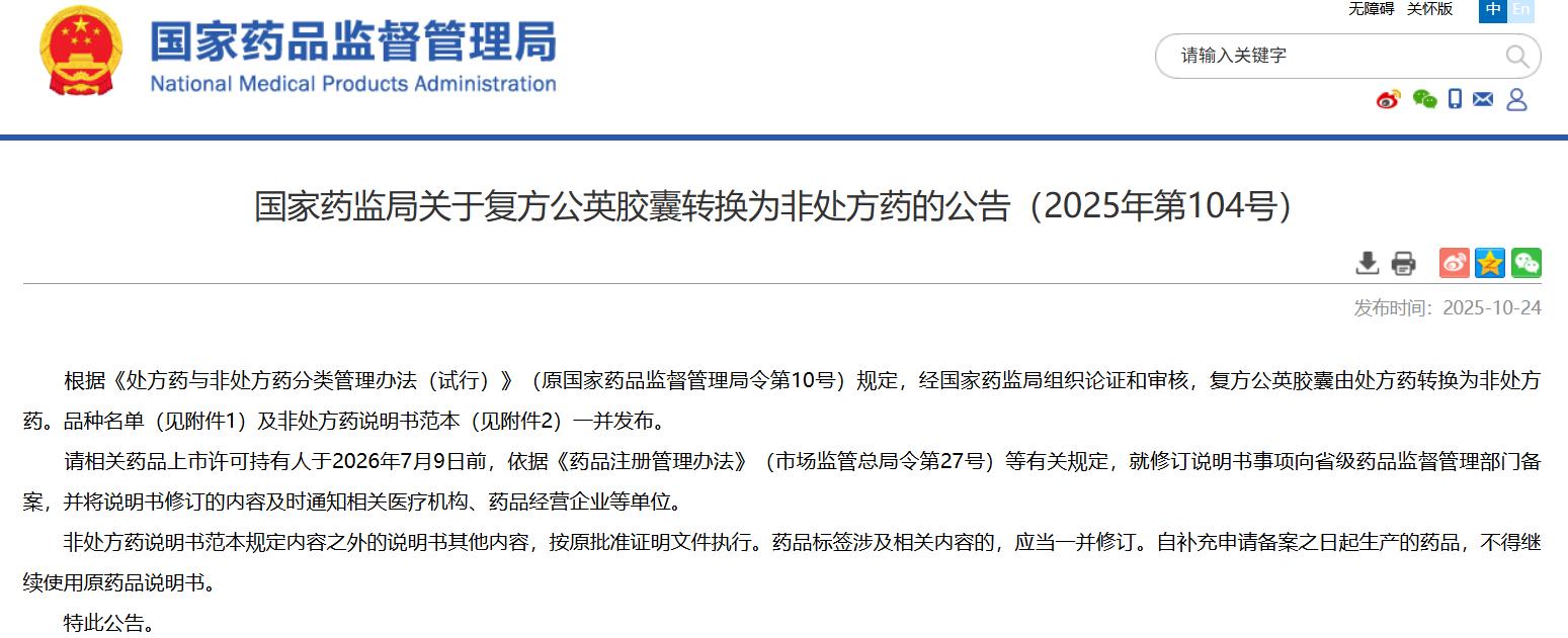 國家藥監局關于復方公英膠囊轉換為非處方藥的公告(2025年第104號)