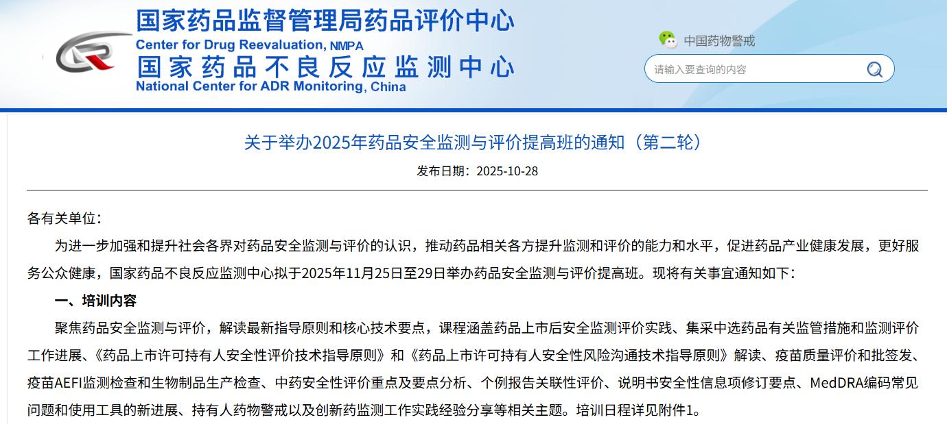 關于舉辦2025年藥品安全監測與評價提高班的通知(第二輪)
