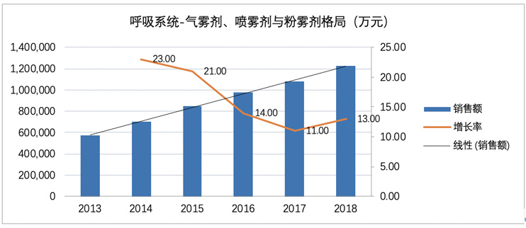 中國城市公立醫院統計,2018年國內氣霧劑、噴霧劑和粉霧劑市場容量為122億元,近5年復合增長率(GAGR)高達+16.38%。