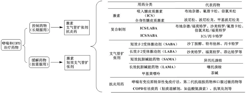 中國及歐美上市治療哮喘和慢性阻塞性肺病的藥物類別主要有:長/短效β2受體激動劑藥物 、長/短效抗膽堿能藥物、糖皮質激素、白三烯受體拮抗劑、細胞因子抑制劑等。