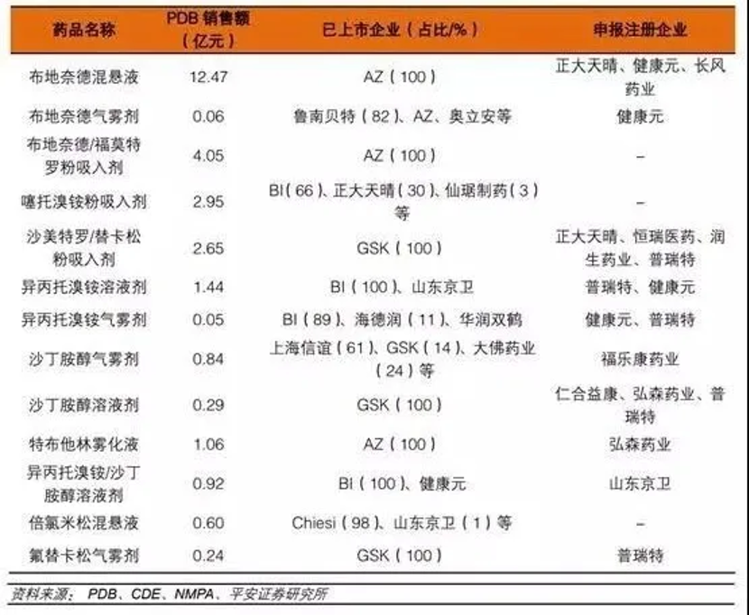 從以上數據可知,目前布地奈德混懸液、布地奈德福莫特羅粉吸入劑、沙美特羅替卡松粉吸入劑等重磅品種國內僅原研獲批,市場份額完全被原研企業占據。國內企業正在積極布局,一旦首仿成功,有望快速實現進口替代。從已上市和研發布局情況來看,正大天晴、健康元、恒瑞醫藥、長風藥業、普瑞特、山東京衛、仙琚制藥等處于領先位置。