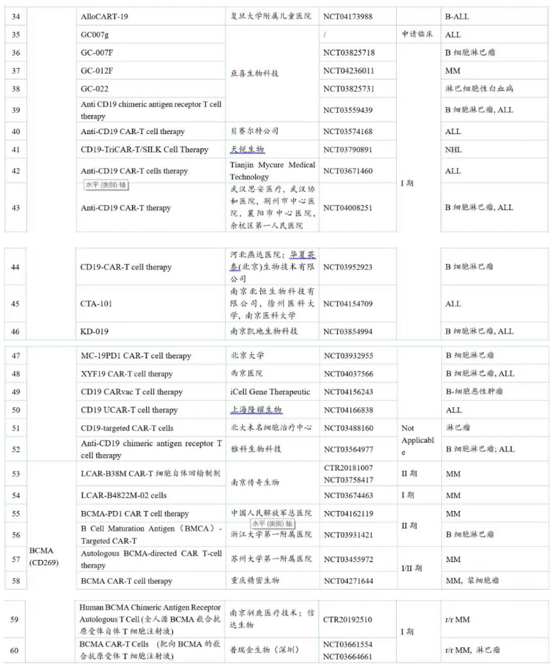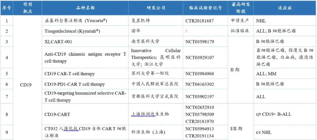 國內針對CD19的CAR-T品種多達50余個,其中進展最快的是國外已上市的Yescarta®,國內暫定名為益基利侖賽注射液,目前已在國內申請上市。此外,有5個中國1類品種處于臨床II期。