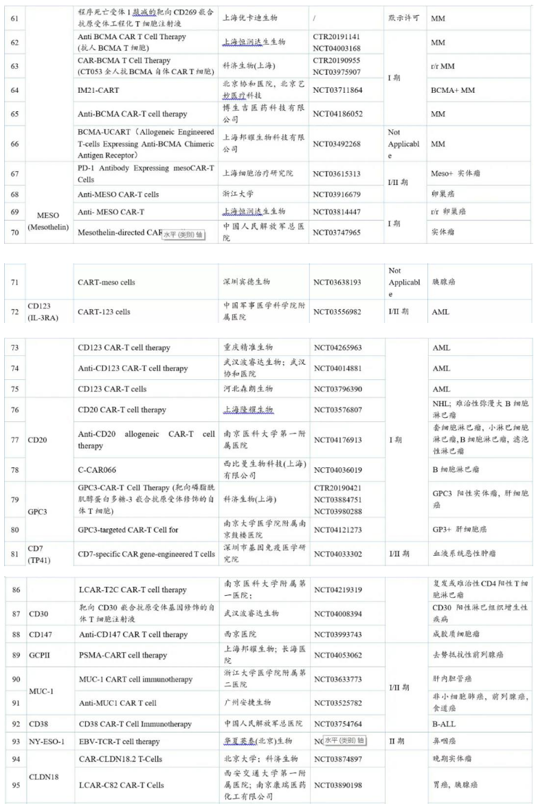 由上表可知,在開發靶點中,研究最多的是治療血液瘤的靶向CD19的品種,其次是治療實體瘤的靶向BCMA和Mesothelin的品種。