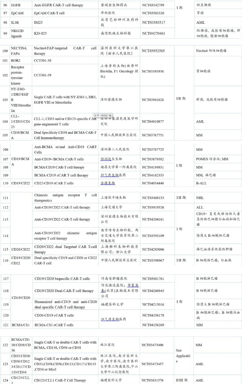我們對上述148個臨床試驗對應的在研品種進行了分析與整合,并結合國內臨床試驗注冊情況,最終共涉及131個CAR-T臨床在研品種,統計于下表中。