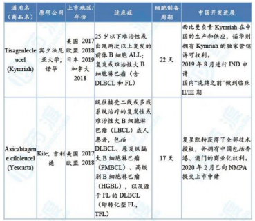 目前,全球共有兩款CAR-T細胞治療產品上市,其具體獲批情況見下表。