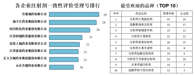 從各企業(yè)注射劑一致性評(píng)價(jià)受理號(hào)排行(圖1)及最受歡迎的注射劑品種可以看出,齊魯制藥、揚(yáng)子江、四川科倫、江蘇恒瑞、宜昌人福、江蘇豪森以及正大天晴注射劑的受理號(hào)均超過(guò)了20個(gè)。另外,在最受歡迎TOP10名單中,以抗炎抗感染類(lèi)大容量品種最受大家青睞,競(jìng)爭(zhēng)激烈。