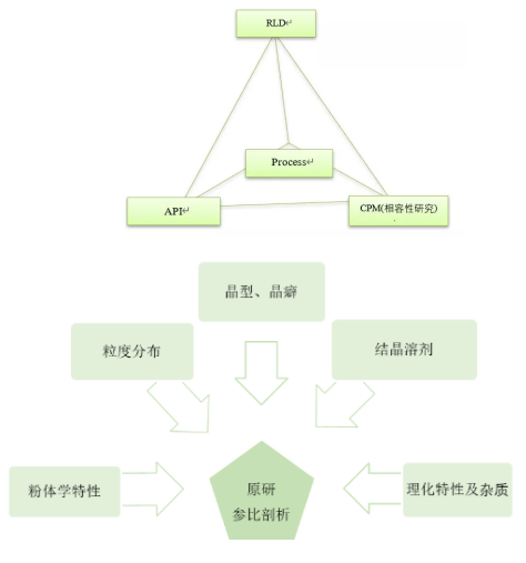 參比剖析、原輔包篩選、工藝研究和相容性研究四個(gè)環(huán)節(jié)的關(guān)系如下圖。幾個(gè)環(huán)節(jié)既相對(duì)獨(dú)立,又相互關(guān)聯(lián),是相輔相成、辯證統(tǒng)一的關(guān)系。