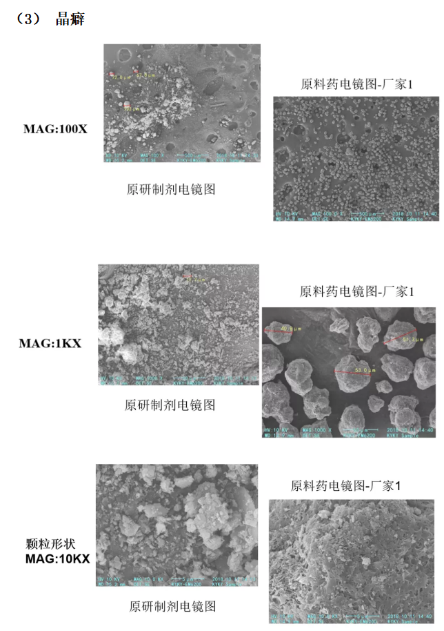 結(jié)果:隨著電鏡掃描放大倍數(shù)的增加,可以更加清楚地看出原料藥和原研制劑的差異:原研制劑的顆粒明顯小于原料藥,而廠(chǎng)家1原料藥的表面更加緊實(shí),所以溶解時(shí)間也會(huì)更長(zhǎng)。