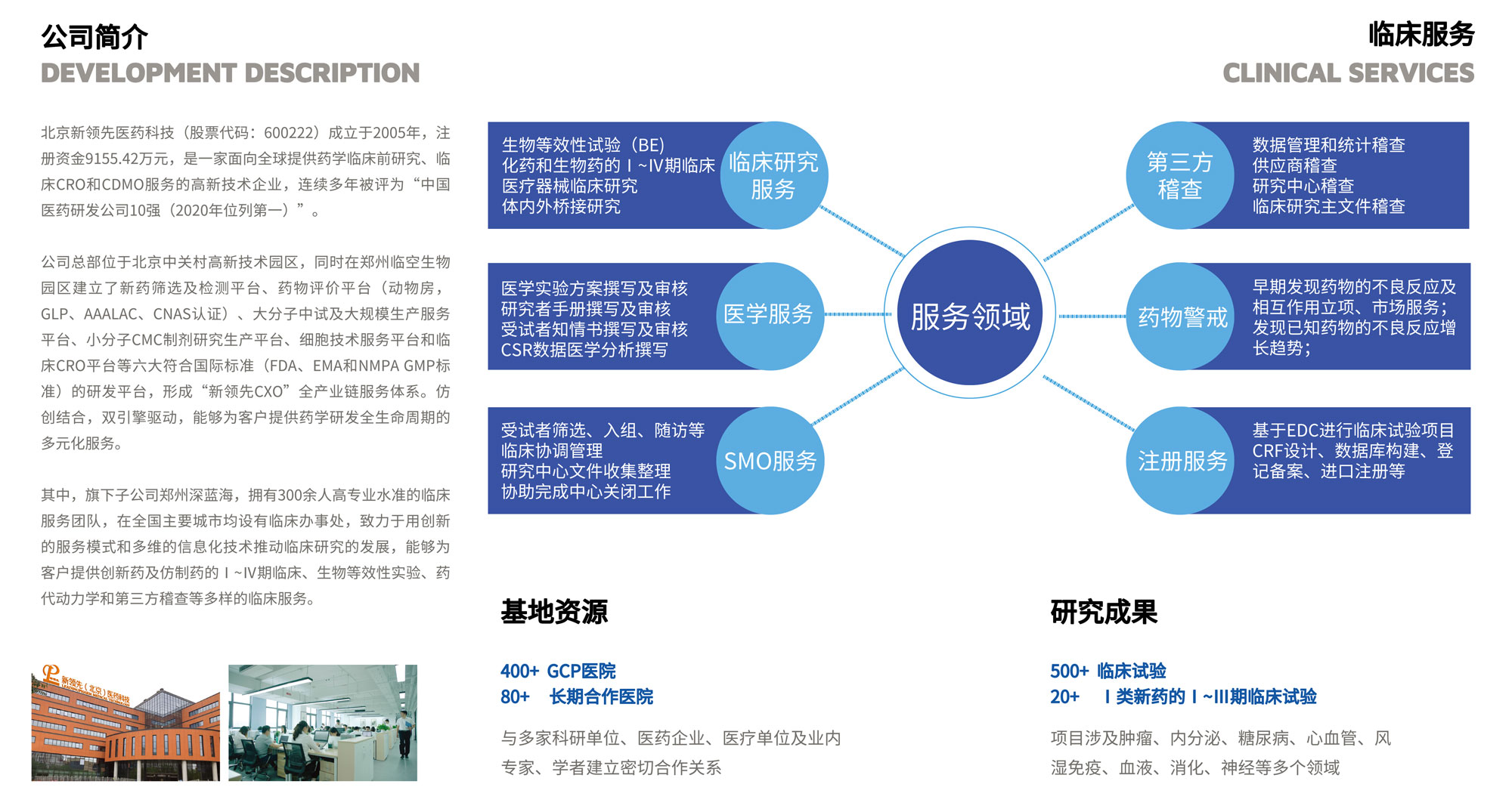 北京新領先(股票代碼:600222)成立于2005年,注冊資金9155.42萬元,是一家面向全球提供藥學臨床前研究、臨床CRO和CDMO服務的高新技術企業,連續多年被評為“中國醫藥研發公司10強(2020年位列第一)”。公司總部位于北京中關村高新技術園區,同時在鄭州臨空生物園區建立了新藥篩選及檢測平臺、藥物評價平臺(動物房,GLP、AAALAC、CNAS認證)、大分子中試及大規模生產服務平臺、小分子CMC制劑研究生產平臺、細胞技術服務平臺和臨床CRO平臺等六大符合國際標準(FDA、EMA和NMPA GMP標準)的研發平臺,形成“新領先CXO”全產業鏈服務體系。仿創結合,雙引擎驅動,能夠為客戶提供藥學研發全生命周期的多元化服務。