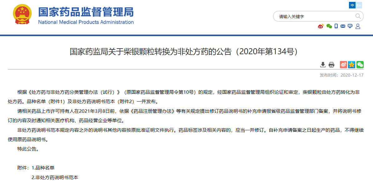 關(guān)于柴銀顆粒轉(zhuǎn)換為非處方藥的公告(2020年第134號(hào))