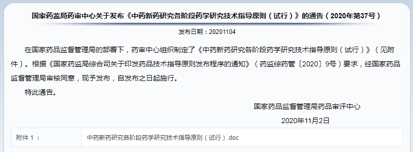 《中藥新藥研究各階段藥學研究技術指導原則(試行)》(2020年第37號)