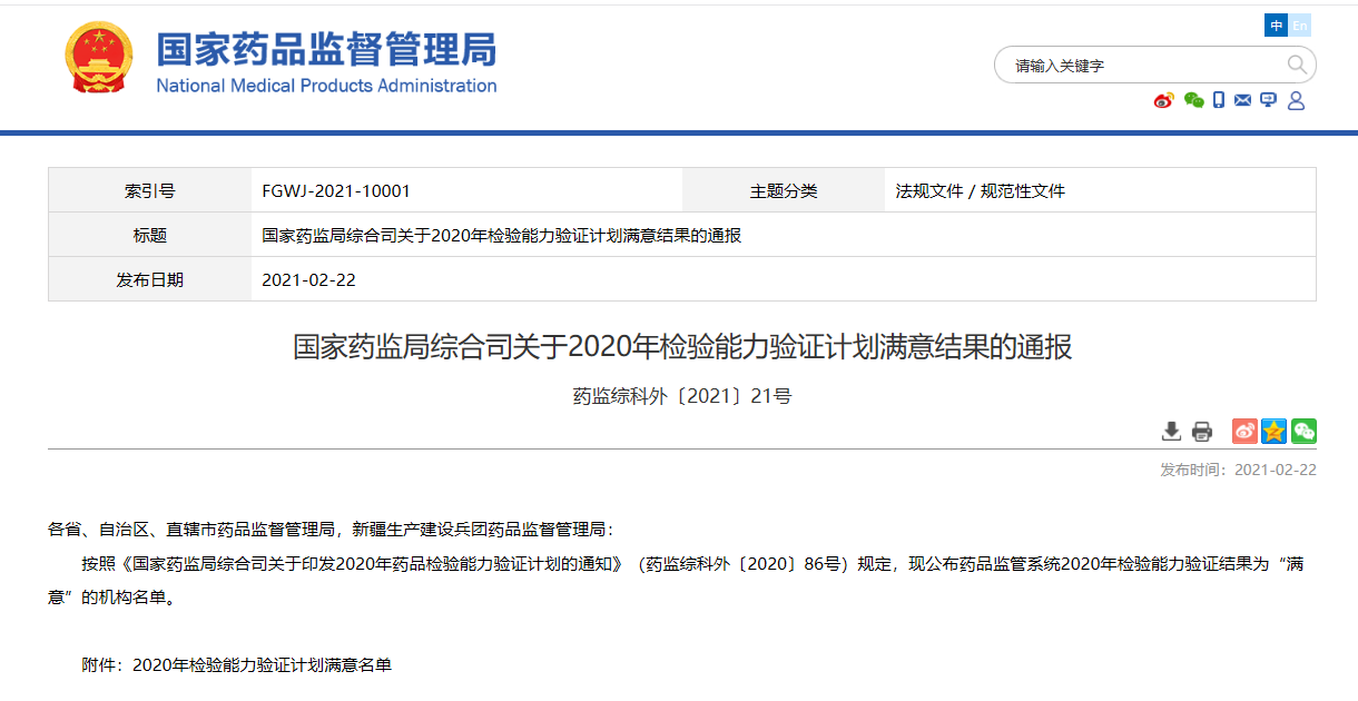 關于2020年檢驗能力驗證計劃滿意結果的通報