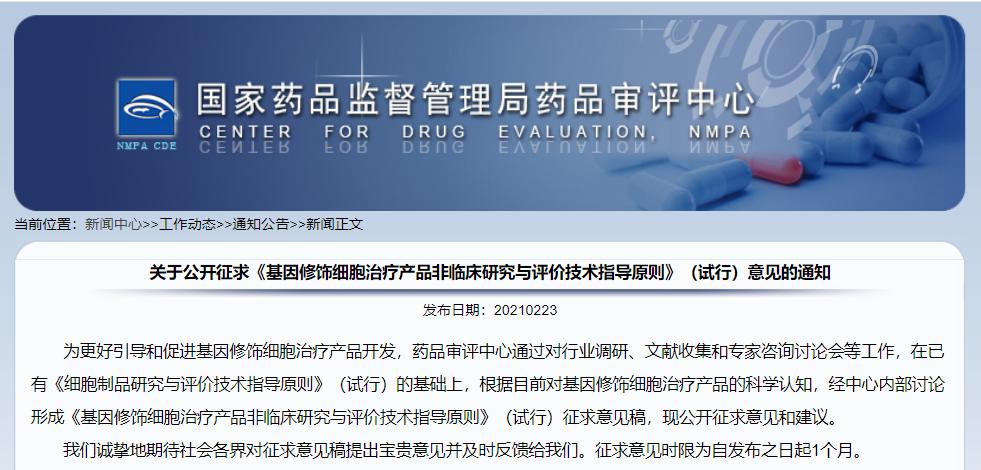 關于公開征求《基因修飾細胞治療產品非臨床研究與評價技術指導原則》(試行)意見的通知