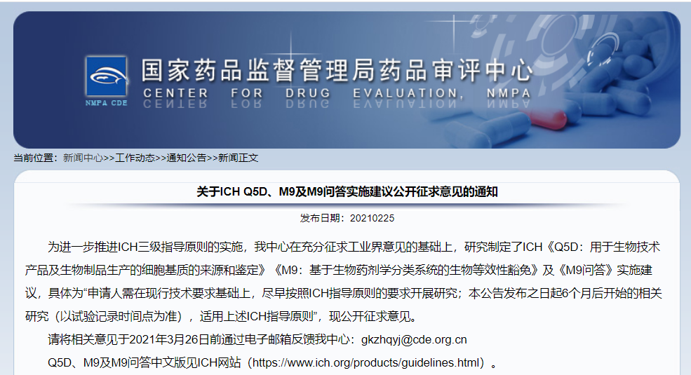 關于ICH Q5D、M9及M9問答實施建議公開征求意見的通知