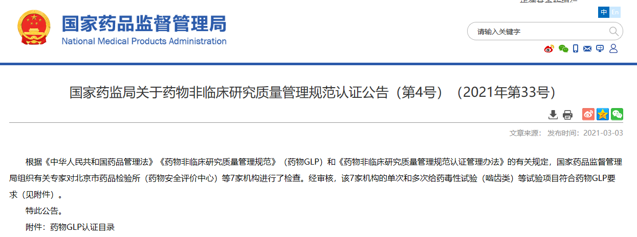 關于藥物非臨床研究質量管理規范認證公告(第4號)(2021年第33號)