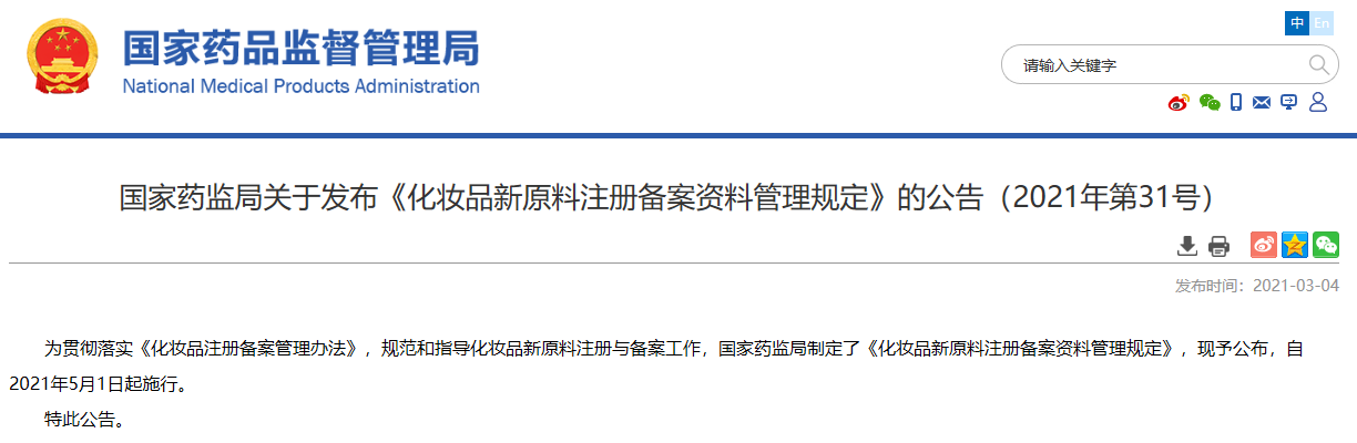 發布《化妝品新原料注冊備案資料管理規定》的公告(2021年第31號)