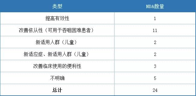 經查詢美國審評綜述,本領域獲批的24個新劑型/新制劑中,4個品種為注射劑,20個品種為口服制劑,總體而言仍然以口服制劑為主。不同品種改良優勢匯總如下,主要改良優勢為改善依從性(可用于吞咽困難患者)和增加兒童制劑為主。