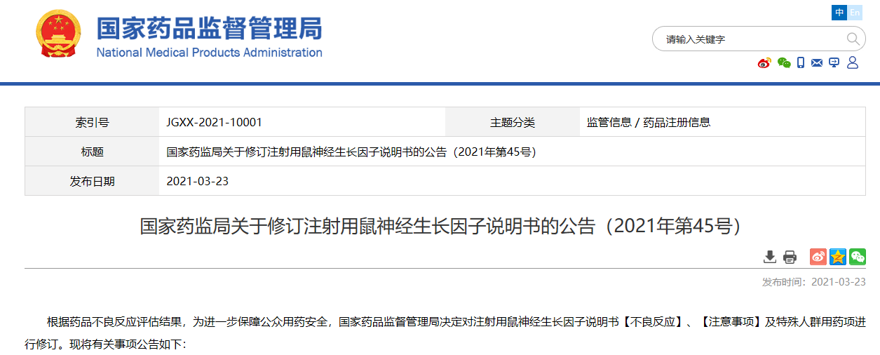 國家藥監局關于修訂注射用鼠神經生長因子說明書的公告(2021年第45號)
