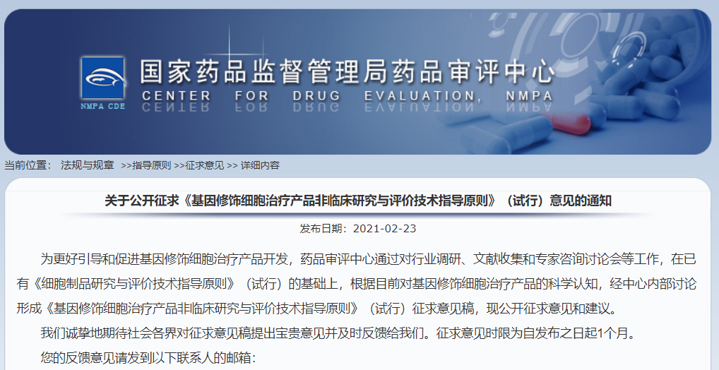 關于公開征求《基因修飾細胞治療產品非臨床研究與評價技術指導原則》(試行)意見的通知