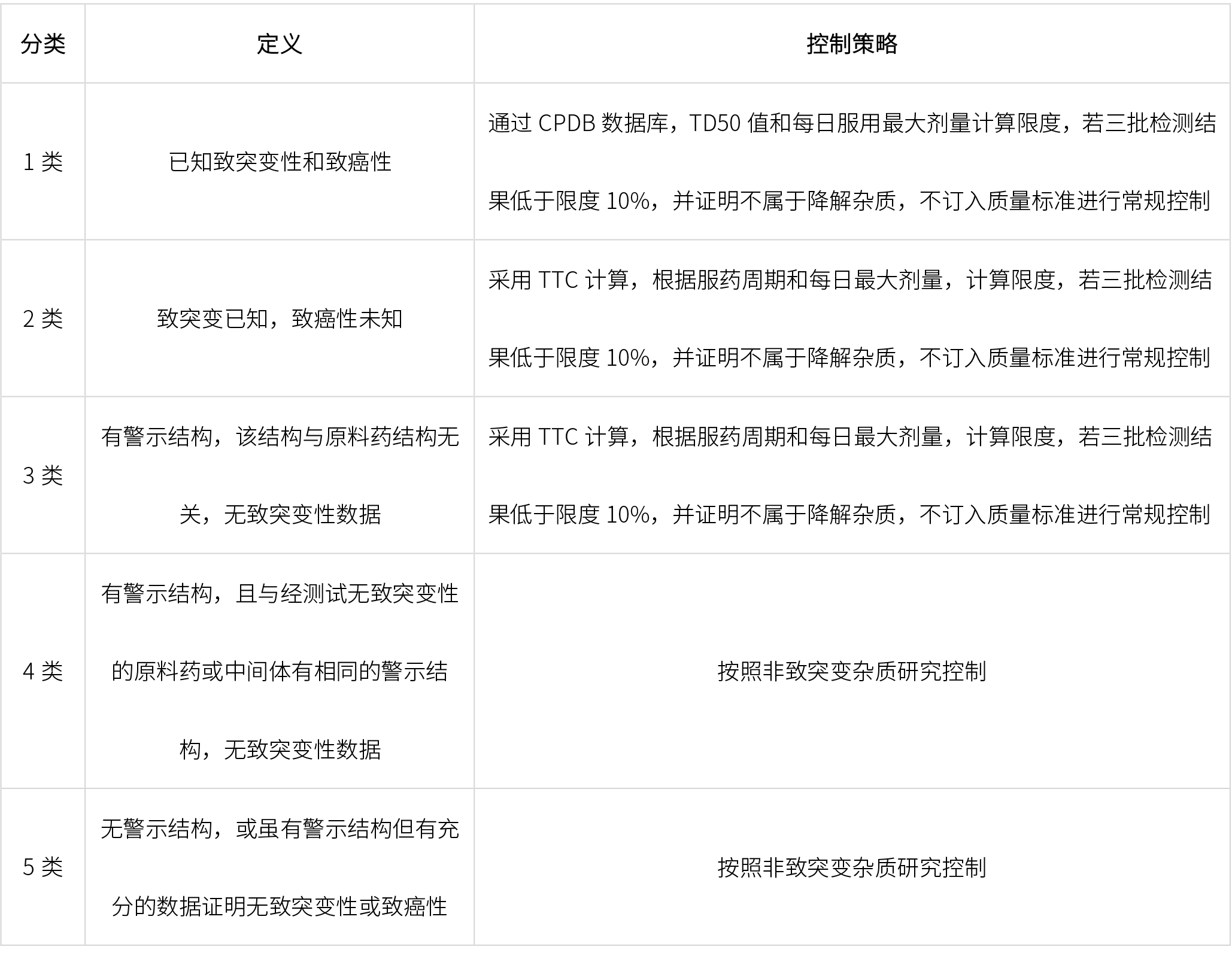 根據生產工藝和警示結構,確定產生致突變雜質,并依據ICH M7進行如下分類,確定相應的控制限度。