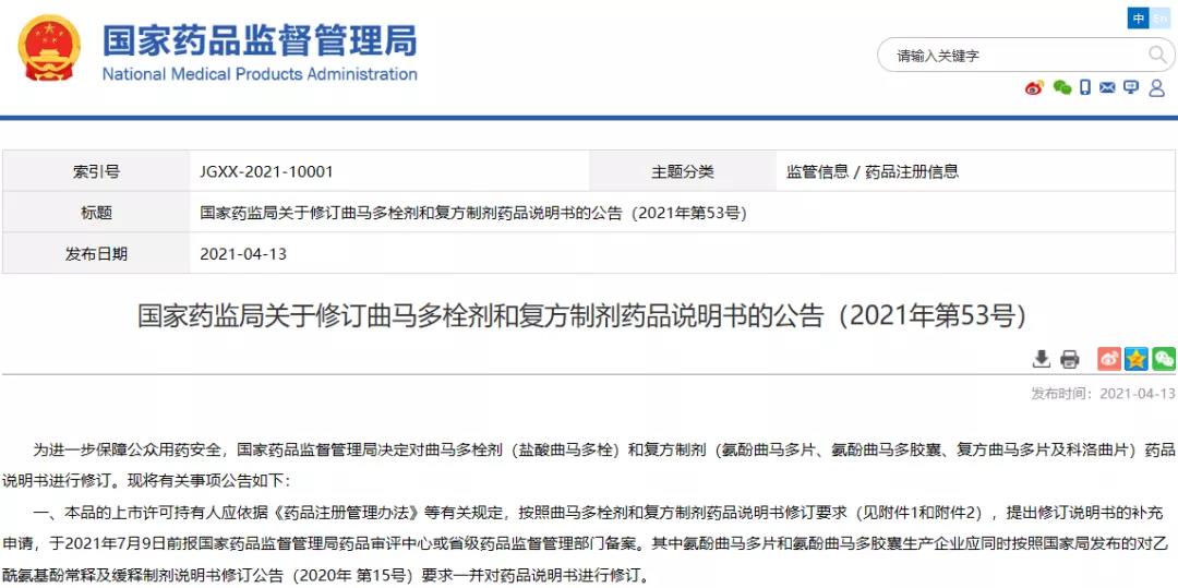 國(guó)家藥監(jiān)局關(guān)于修訂曲馬多栓劑和復(fù)方制劑藥品說(shuō)明書的公告(2021年第53號(hào))