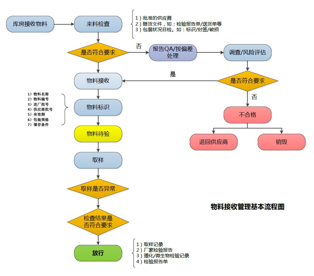 物料接收包括物料從入庫到存放、取樣、檢驗(yàn)、放行的全過程, 著重說明物料接收的步驟、檢查內(nèi)容和注意事項(xiàng)。
