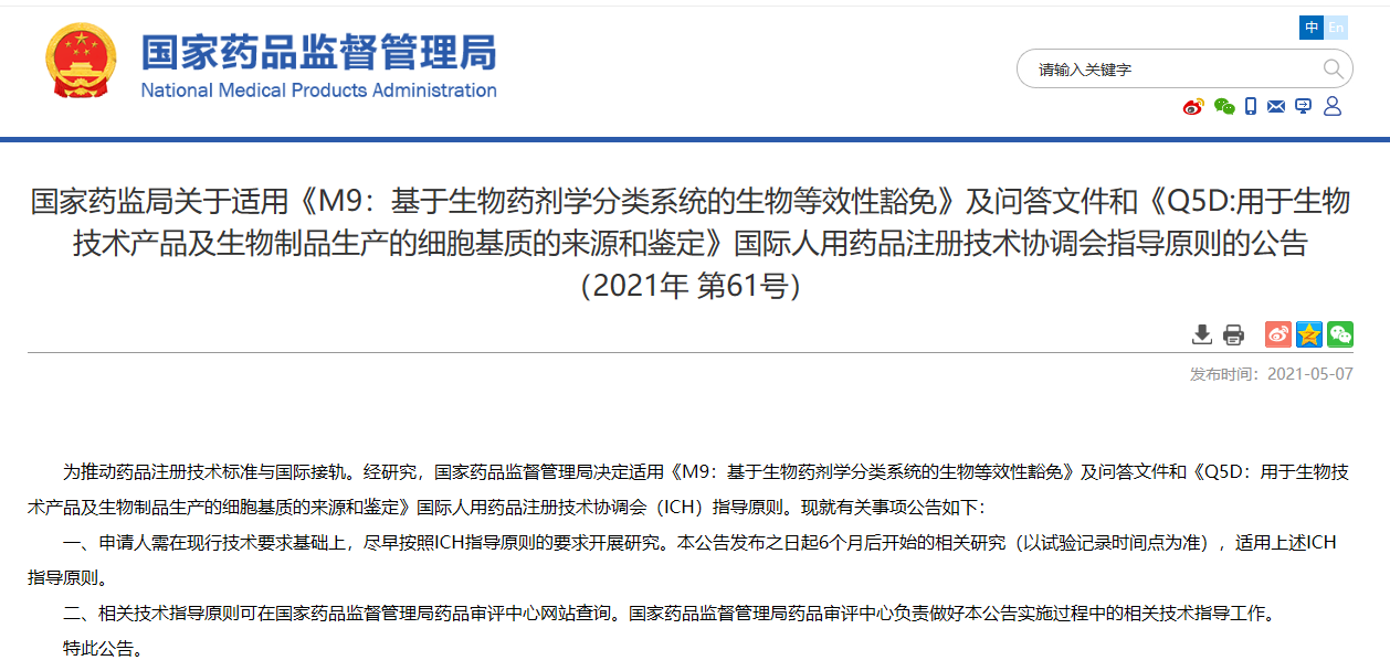 關于適用《M9:基于生物藥劑學分類系統(tǒng)的生物等效性豁免》及問答文件和《Q5D:用于生物技術產(chǎn)品及生物制品生產(chǎn)的細胞基質(zhì)的來源和鑒定》國際人用藥品注冊技術協(xié)調(diào)會指導原則的公告(2021年 第61號)