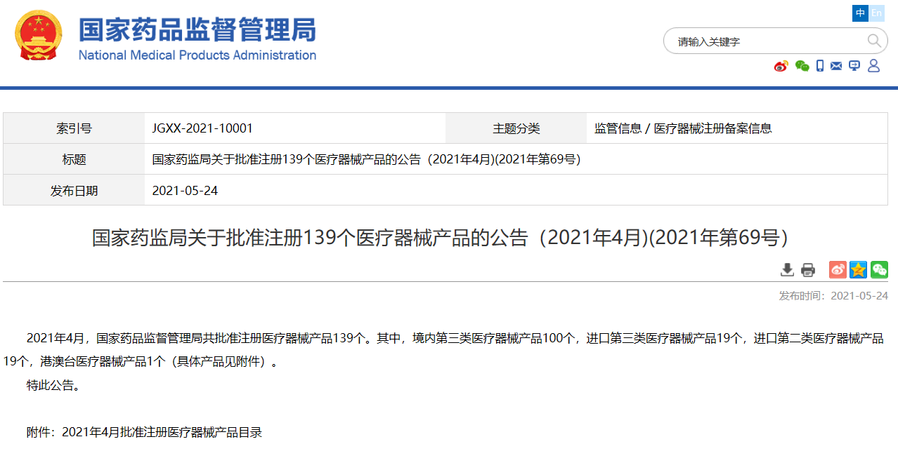 國家藥監局關于批準注冊139個醫療器械產品的公告(2021年4月)(2021年第69號)