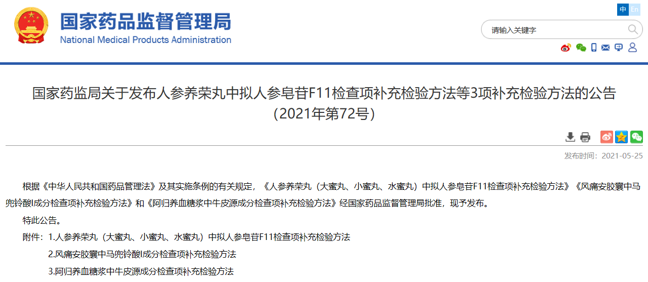 國家藥監局關于發布人參養榮丸中擬人參皂苷F11檢查項補充檢驗方法等3項補充檢驗方法的公告(2021年第72號)