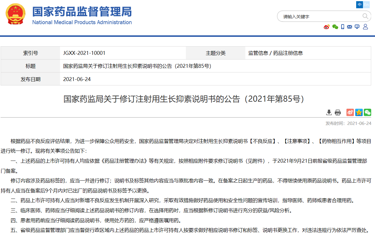 國家藥監局關于修訂注射用生長抑素說明書的公告(2021年第85號)